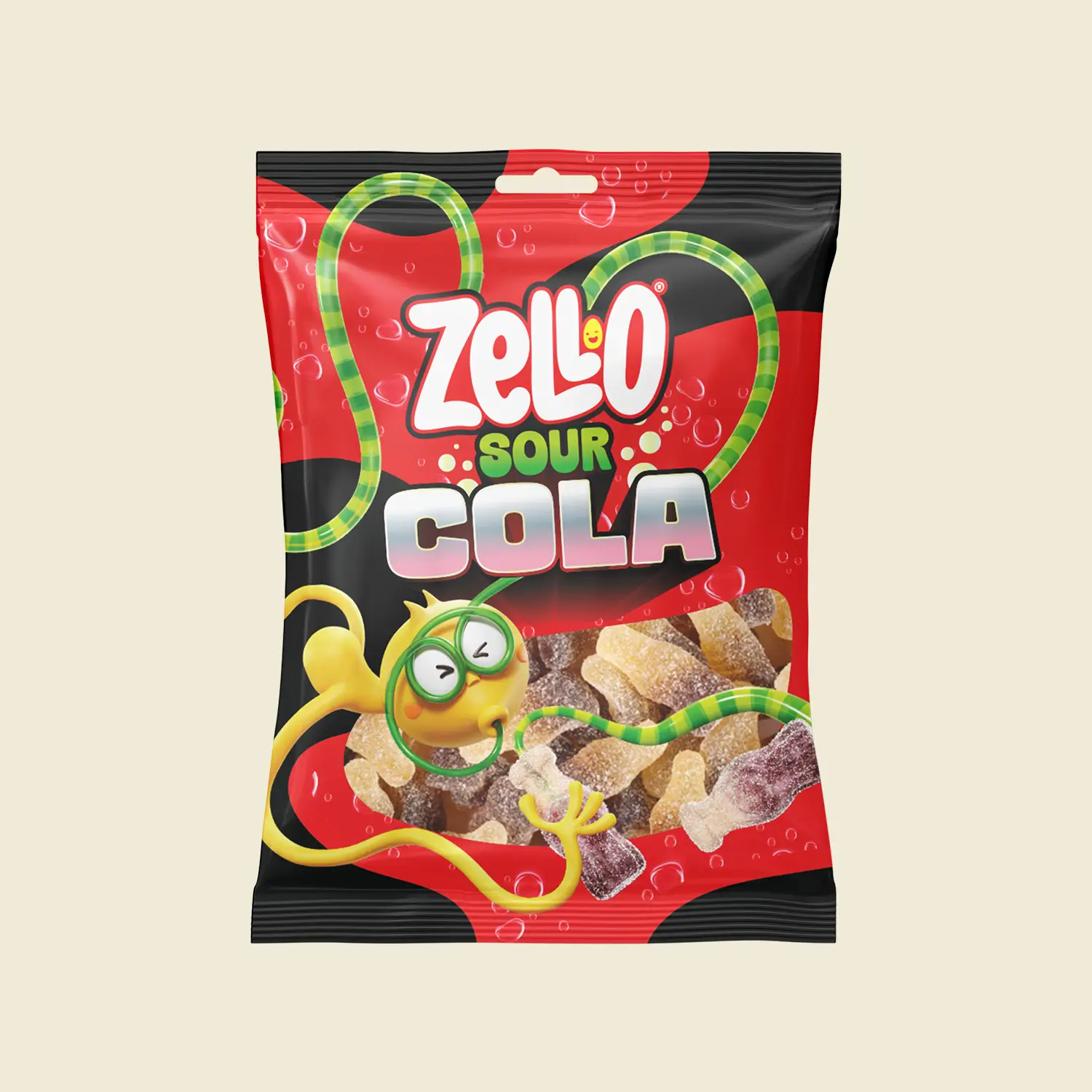 Sour cola bottle gummies in a bag – tangy, fizzy, and chewy.